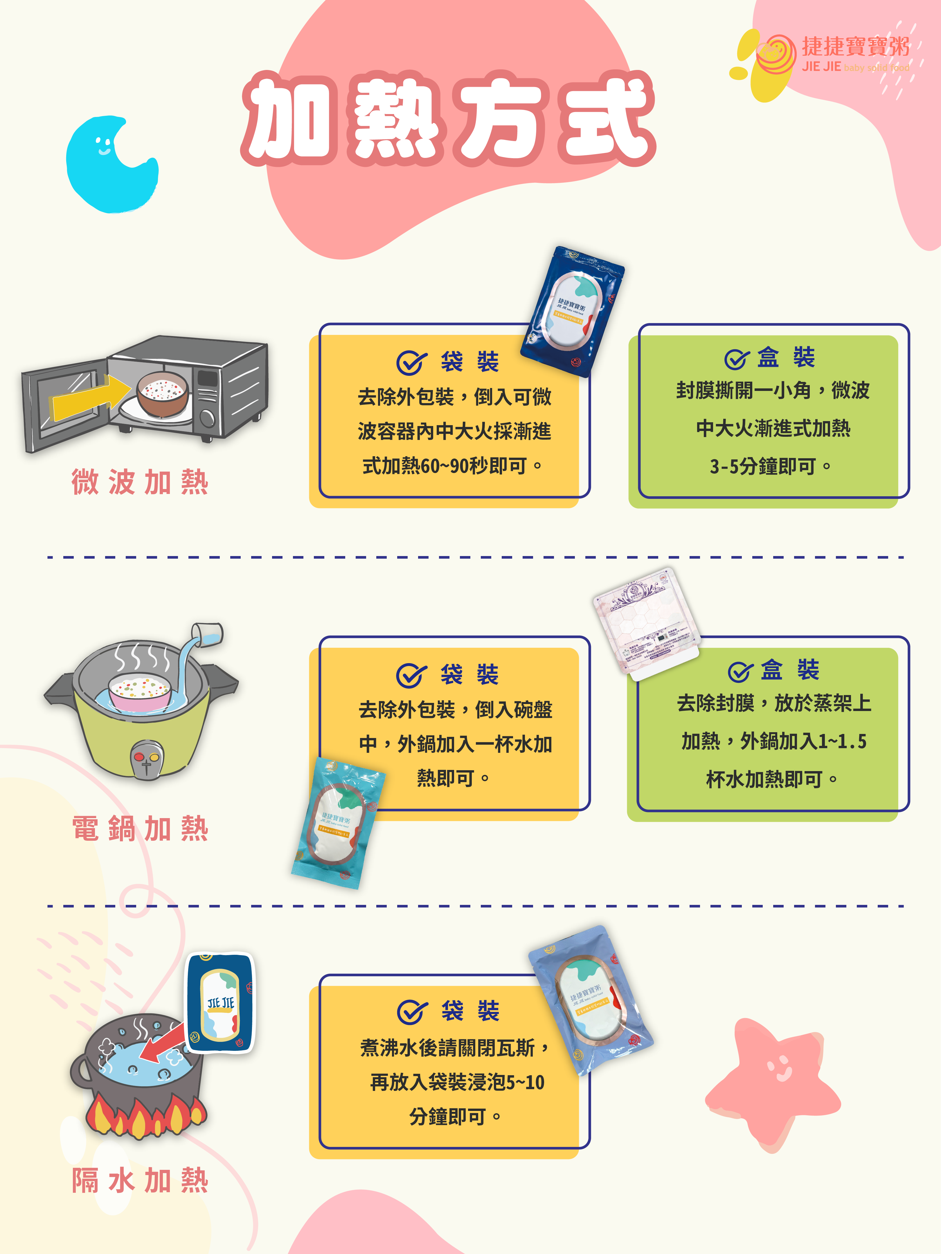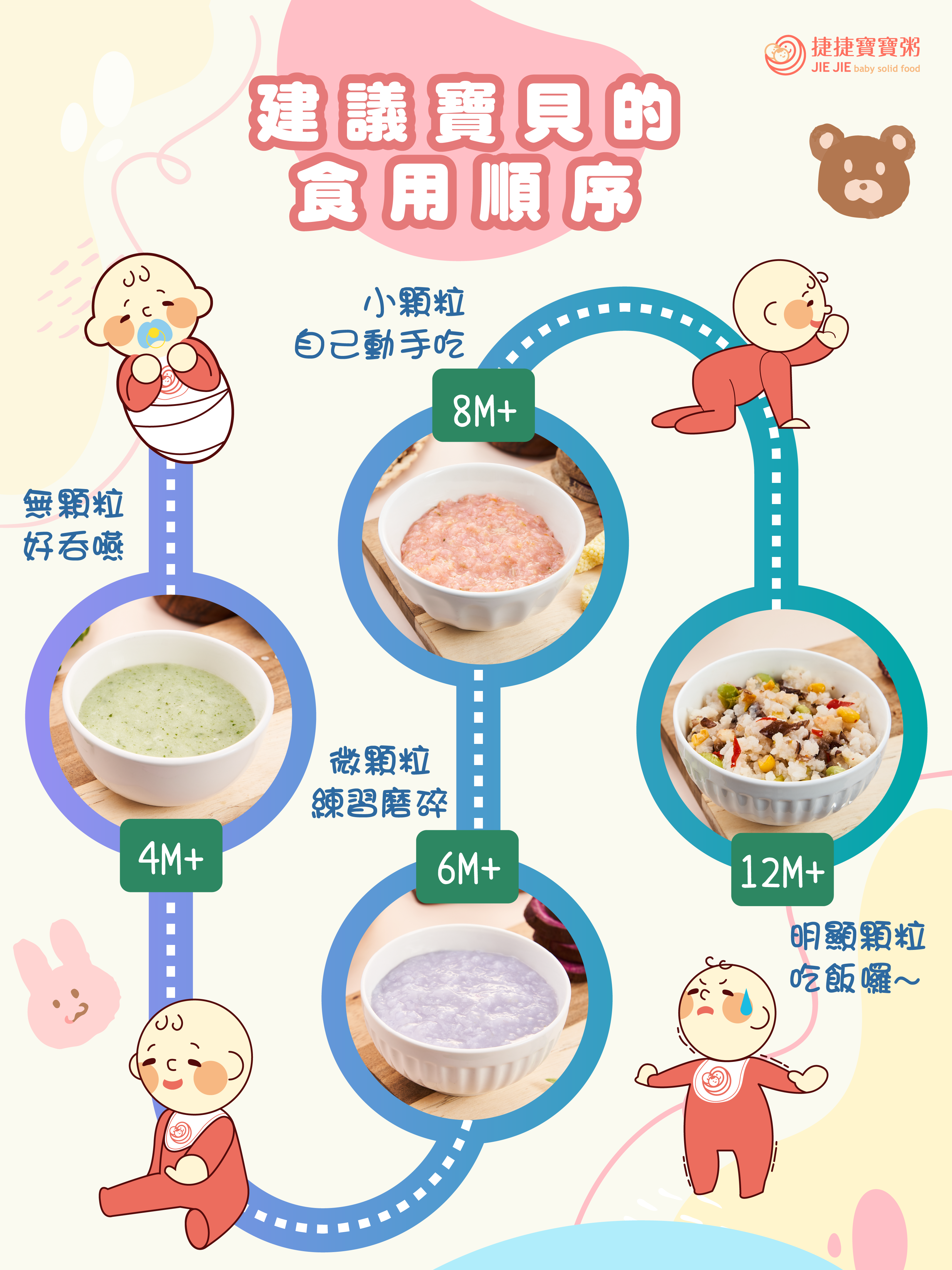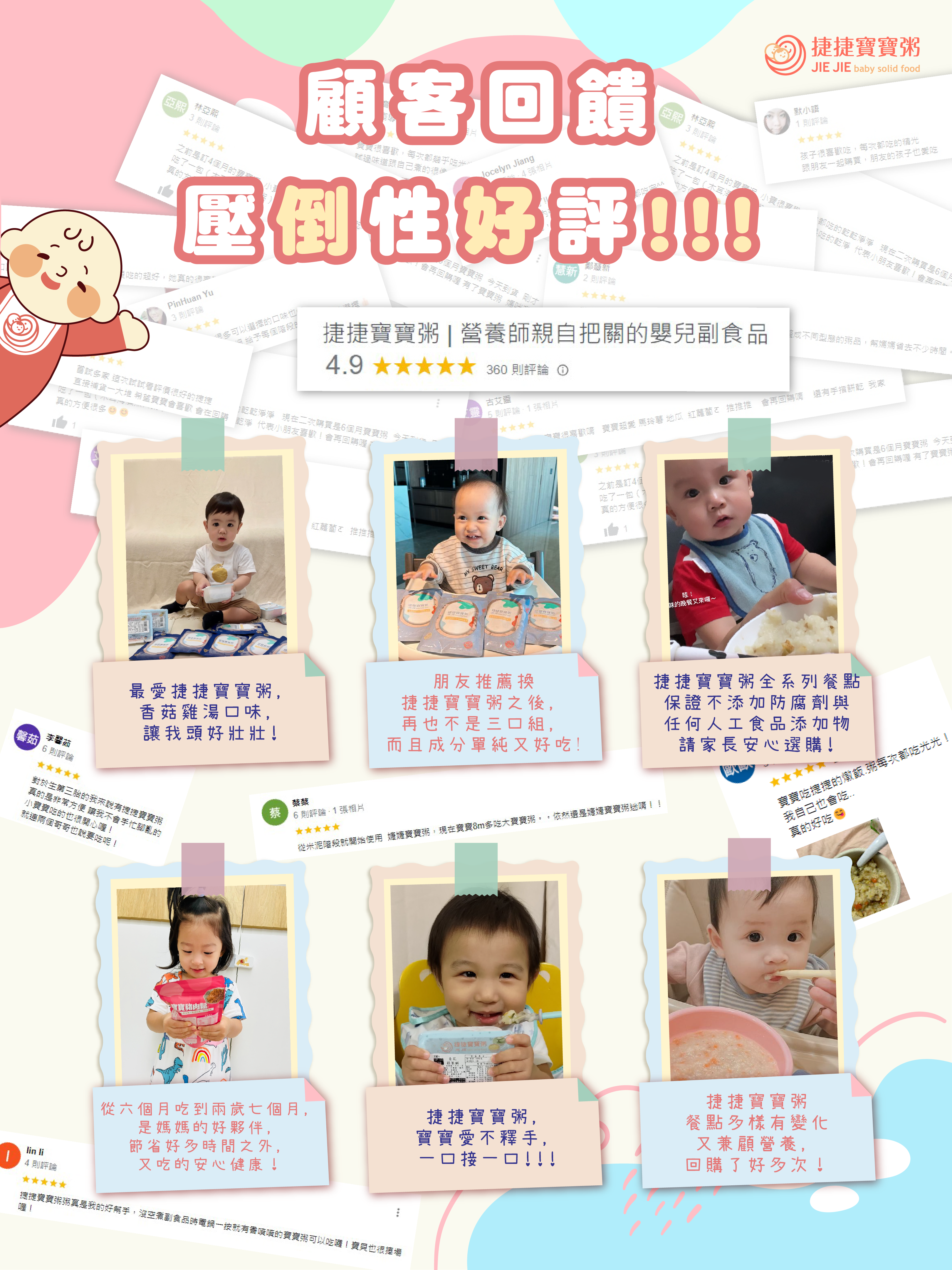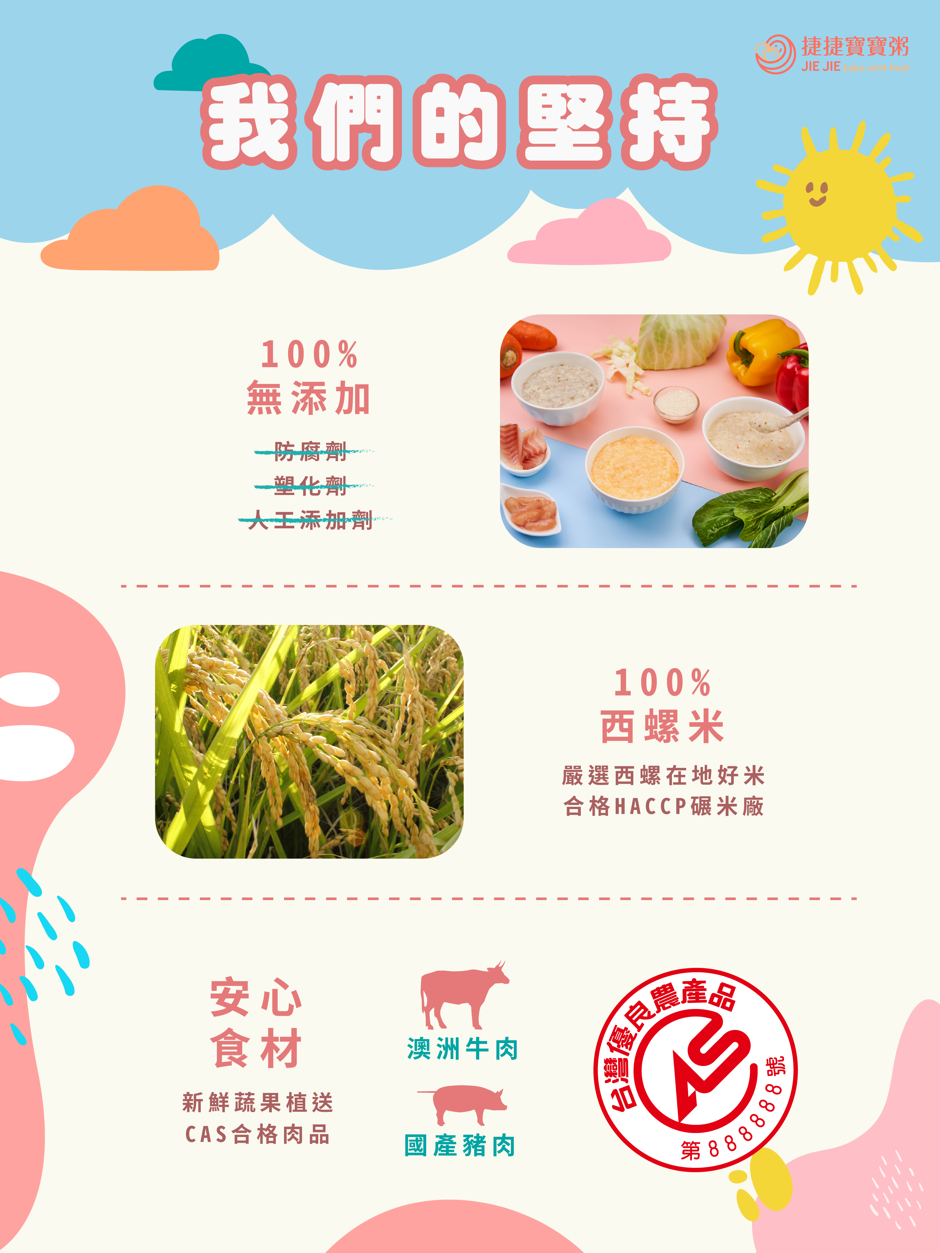 捷捷寶寶粥全系列餐點保證不添加防腐劑與任何人工食品添加物,請家長安心選購!