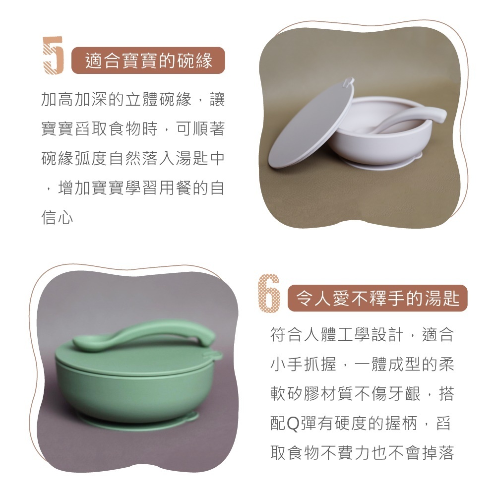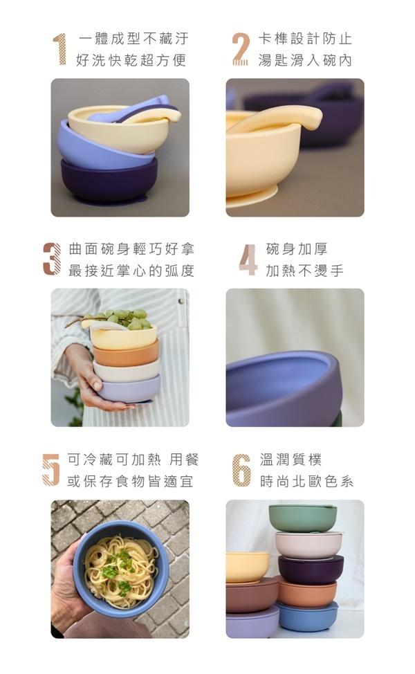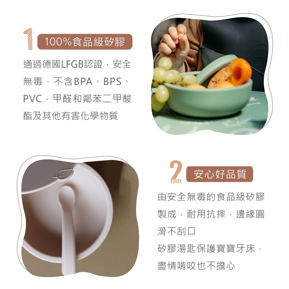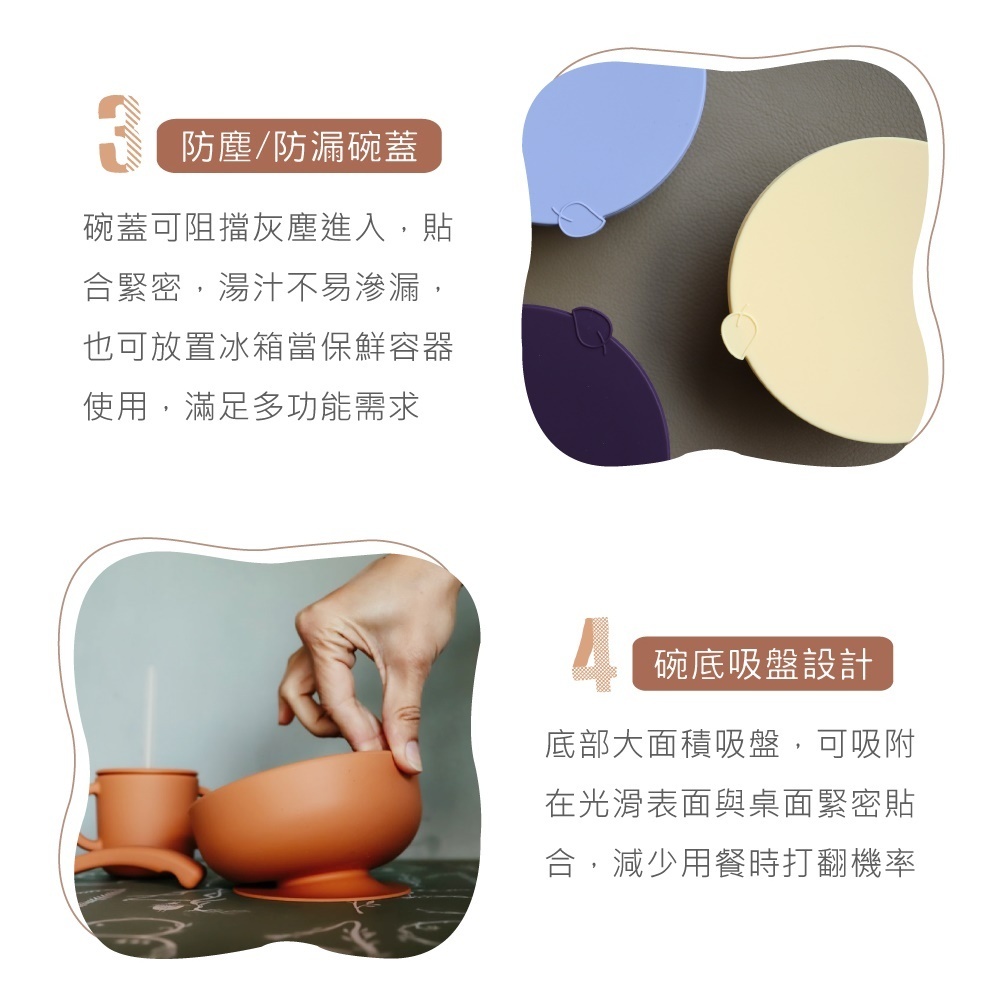 ·100%食品級矽膠,通過德國LFGB認證,安全無毒 ·防塵防漏碗蓋,美食盛裝好攜帶 ·碗底強力吸盤,用餐不易翻倒 ·Q彈厚實湯匙,好入口好抓握 ·隨心享受美味主食、湯品與小點心!