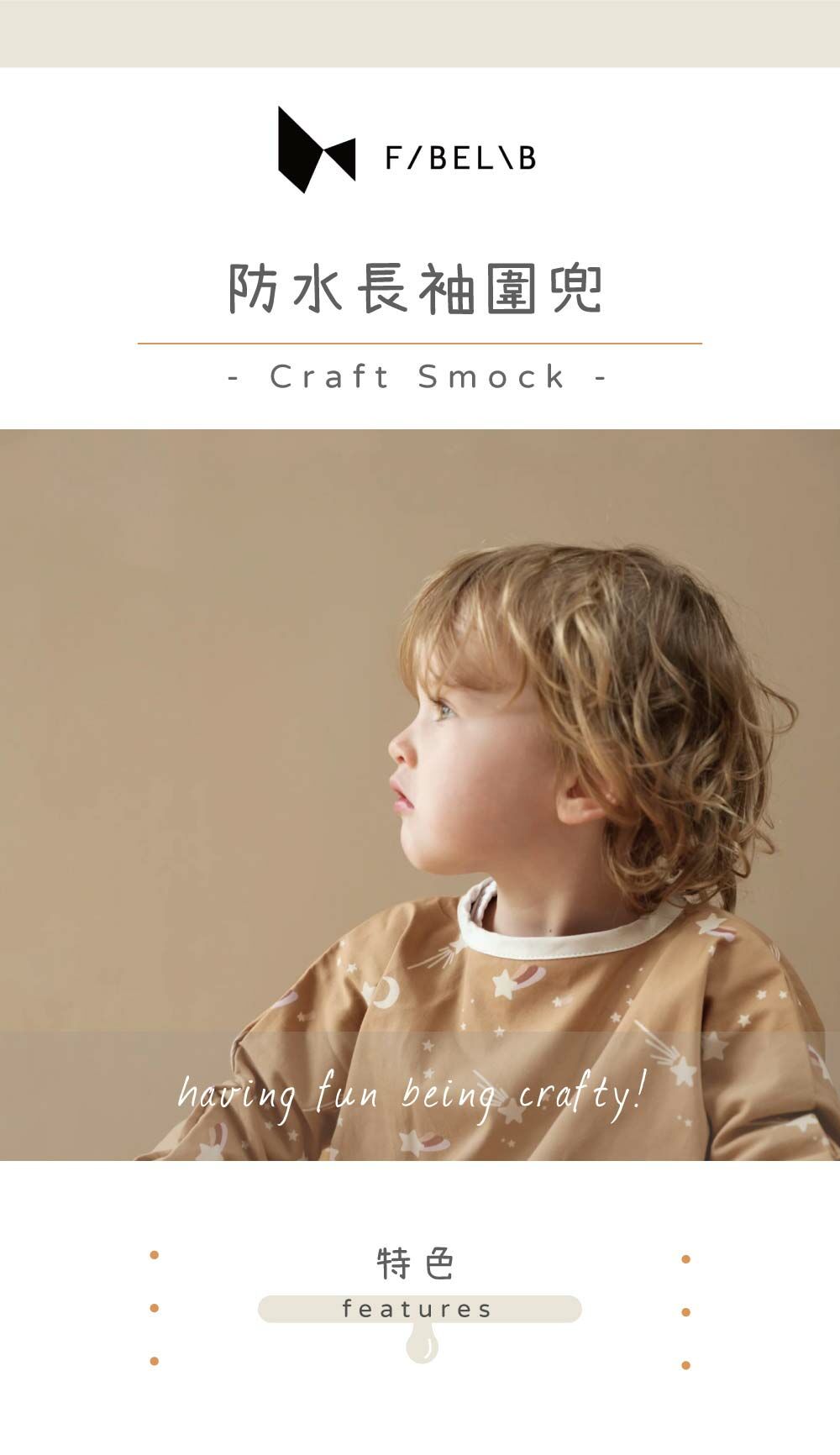 Fabelab長袖圍兜採用100%有機棉與防水塗層,耐髒防污輕巧透氣