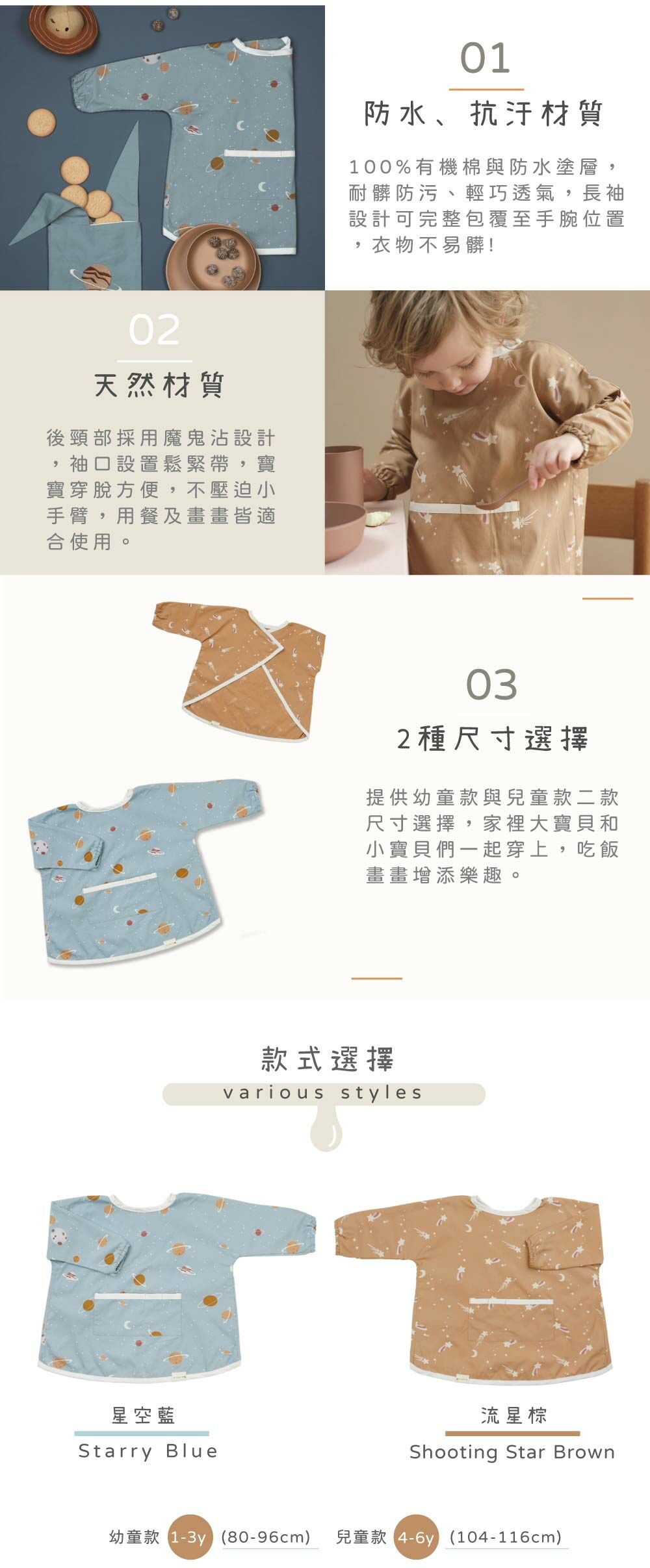 後頸部採用魔鬼沾黏貼,袖口則為鬆緊帶設計,讓寶寶活動自如穿脫方便!