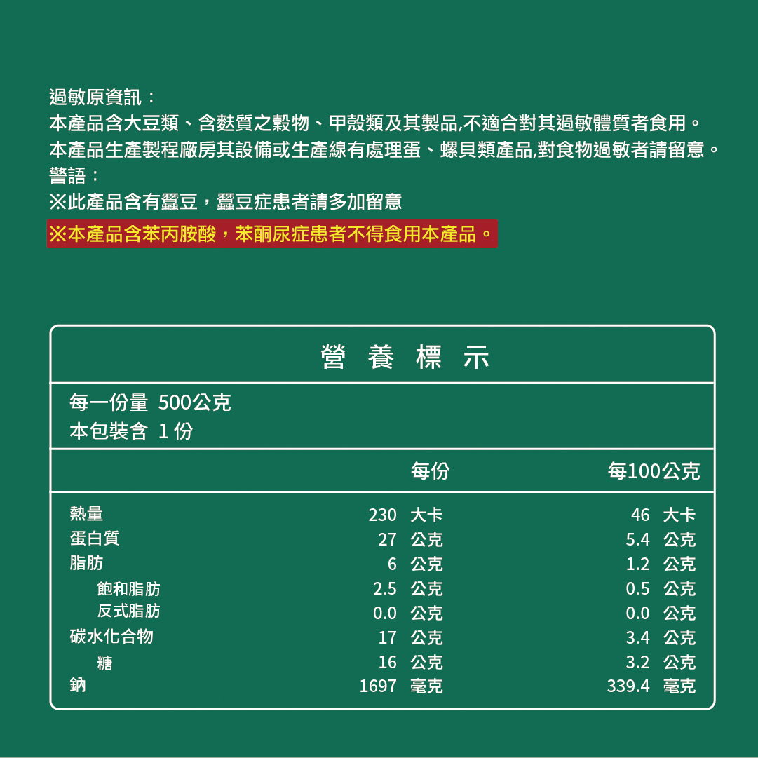 ●本產品含苯丙胺酸,苯酮尿症患者不得食用本產品。