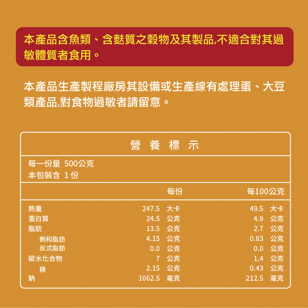 ●本產品含有魚類、含麩質之穀物及其製品,不適合對其過敏體質者食用。