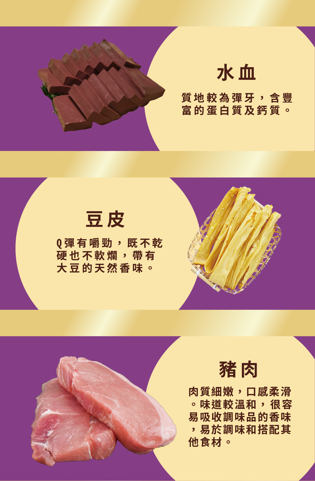 水、水血(水、鴨血、鹽、多磷酸鈉、酸性焦磷酸鈉、矽樹脂、脂肪酸山梨醇酐脂、聚山梨醇酐脂肪酸酯六十五、羧甲基纖維素鈉)、豬肉(台灣)、豆皮(黃豆、大豆沙拉油)、筍絲、木耳、