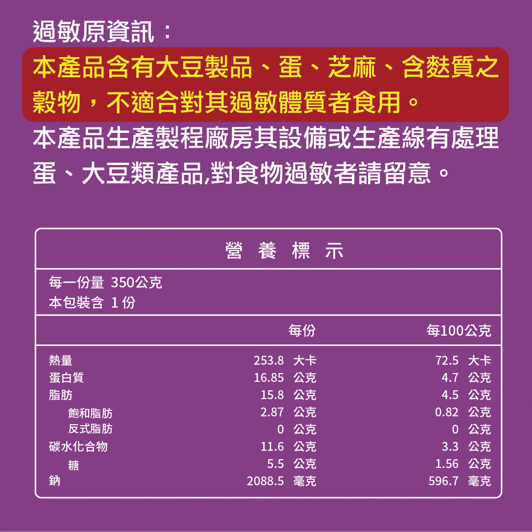 ●本產品含有大豆製品、蛋、芝麻、含麩質之穀物,不適合對其過敏體質者食用。