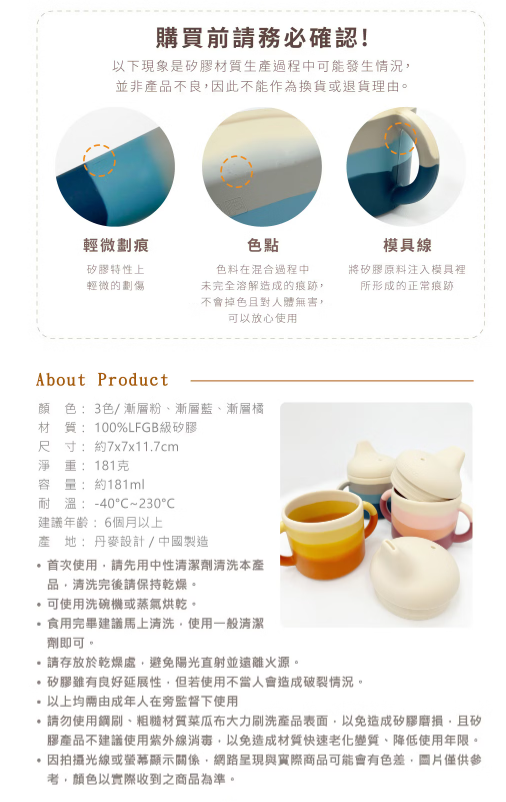 請勿使用鋼刷、粗糙材質菜瓜布大力刷洗產品表面,以免造成矽膠磨損,且矽膠產品不建議使用紫外線消毒,以免造成材質快速老化變質、降低使用年限
