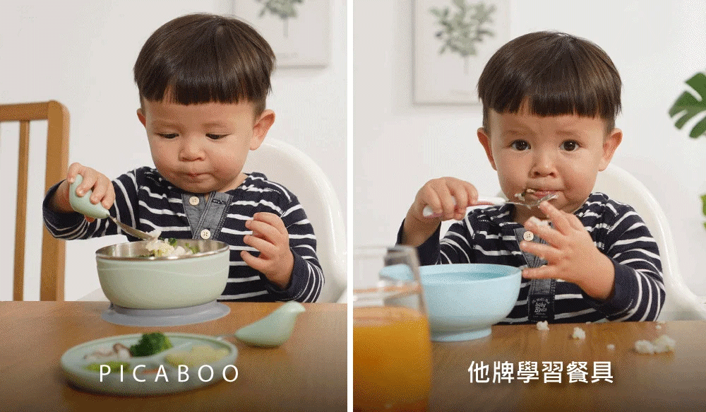 | CYDterra | PICABOO是針對各階段孩子肌肉發展的兩階段握把設計(已取得台灣新型專利認證)。既適用1歲時期的握拳頭鏟食抓握,亦適用2-3歲後的三點湯匙握法,幫助家長在適當的時機教育孩子轉銜抓握方式。